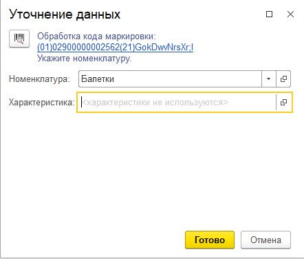 Если на обуви проставлена марка, то возможны 2 ситуации. При считывании кассиром марки, выпущенной через личный кабинет или программу 1С по упрощенному описанию, в программе понадобится уточнить номенклатуру, с помощью её выбора из справочника.