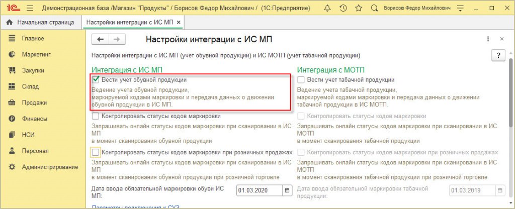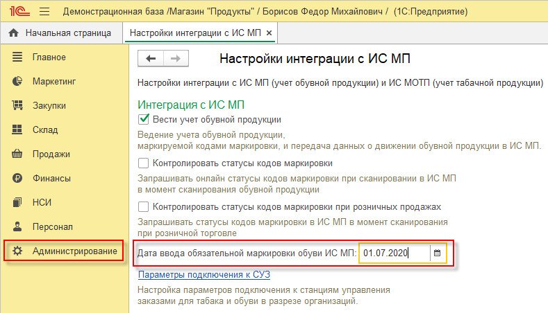 Оформление марок через программу осуществляется после установки признака использования интеграционного интерфейса – «Вести учет обувной продукции». Надо только зайти в «Администрирование» и найти «настройки интеграции с ИС МП».