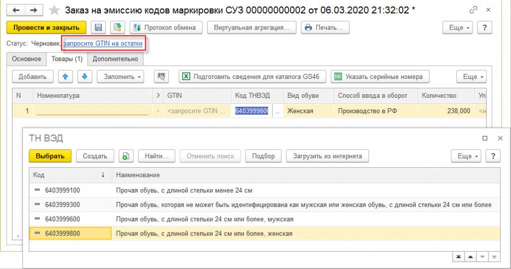 После этих действий в закладке «Товары» вводится ровно столько товарных строк, сколько категорий оставшейся обуви нашлось в магазине, но не более восьми. Каждой строке нужно присвоить код ТН ВЭД из выпадающего перечня (например, 6403999300, 6403999100,  6403999600, 6403999800), вид товара (обуви в нашем случае) и способ введения в оборот. GTIN на оставшийся ассортимент запрашивается через ИС МП с использование гиперссылки, а после этого наименование номенклатуры в соответствующей строке создастся автоматическим образом согласно установленным параметрам. Каждый код остатков начинается с комбинации «029….».