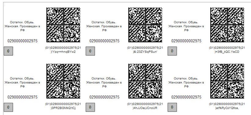 Наименование этикеткам даётся в зависимости от категории оставшейся обуви, к примеру, «Остаток.Обувь.Мужская.Произведена в КНР». У этикеток также один и тот же номер GTIN, однако для каждой пары обуви будет свой код маркировки. Внимательное изучение символов во второй строке подписи под квадратным кодом DataMatrix позволит в этом убедиться.