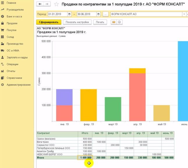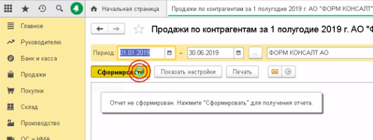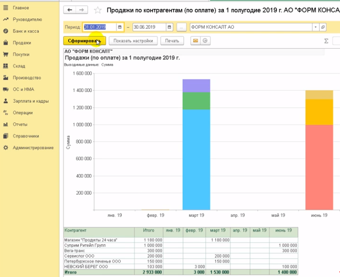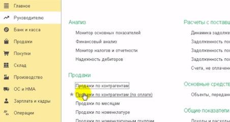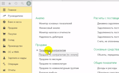 Сформируем отчет продажи по контрагентам из раздела отчетов для руководителя