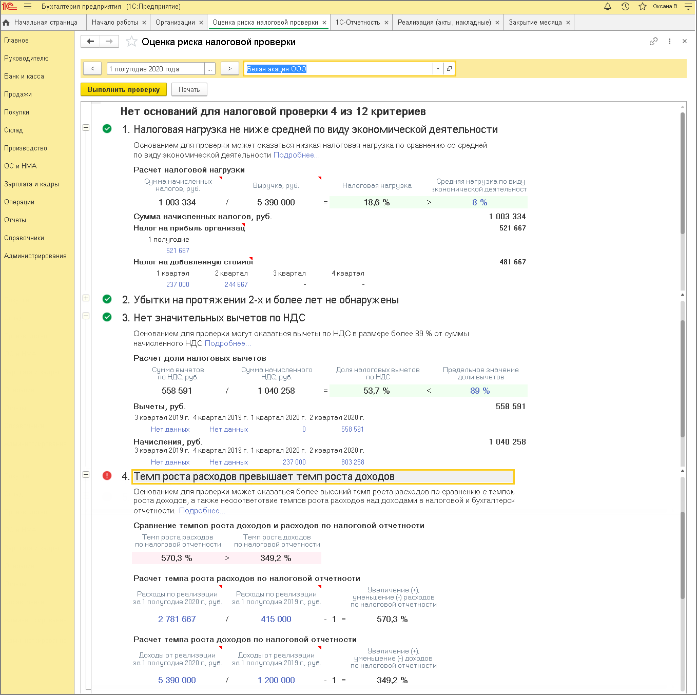 - зайти в раздел "Отчеты" и создать новый документ "Оценка риска налоговой проверки";