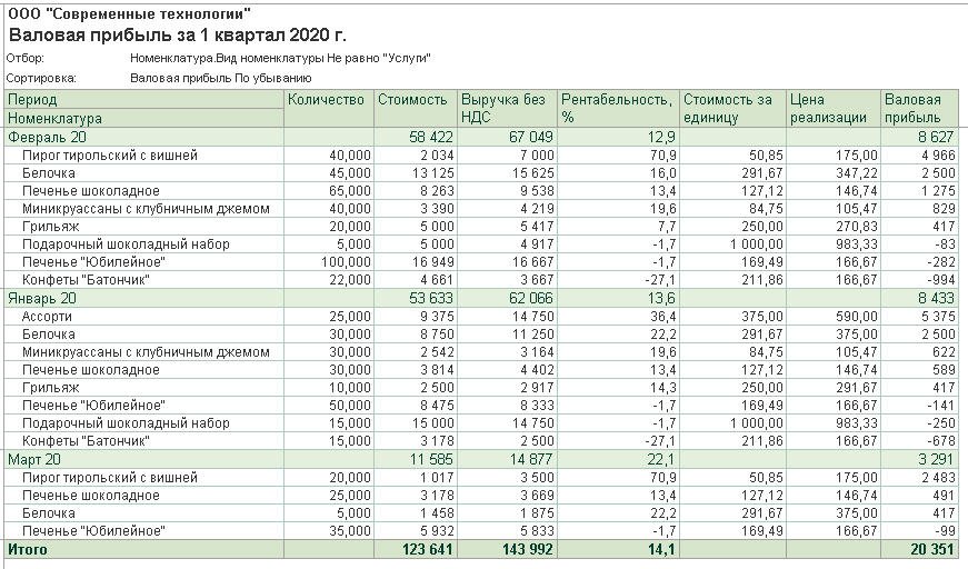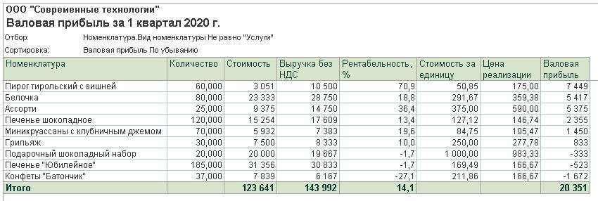 Если использовать отчет по умолчанию, первыми будут выведены товары, которые реализованы с максимальной валовой прибылью.