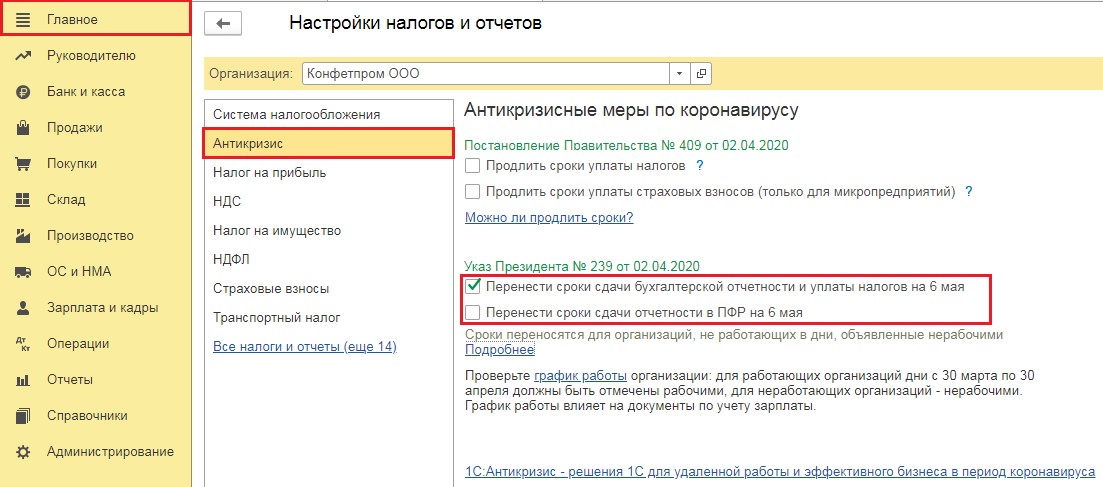 Чтобы перенести сроки сдачи финансовой отчётности нужно в том же разделе «Антикризис» установить флажок возле окошка «Перенос сроков сдачи бухгалтерской отчётности и уплаты налогов»