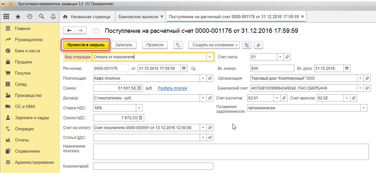 Если выписка не отмечена зеленой галочкой, провести и разнести документ нужно будет самостоятельно: