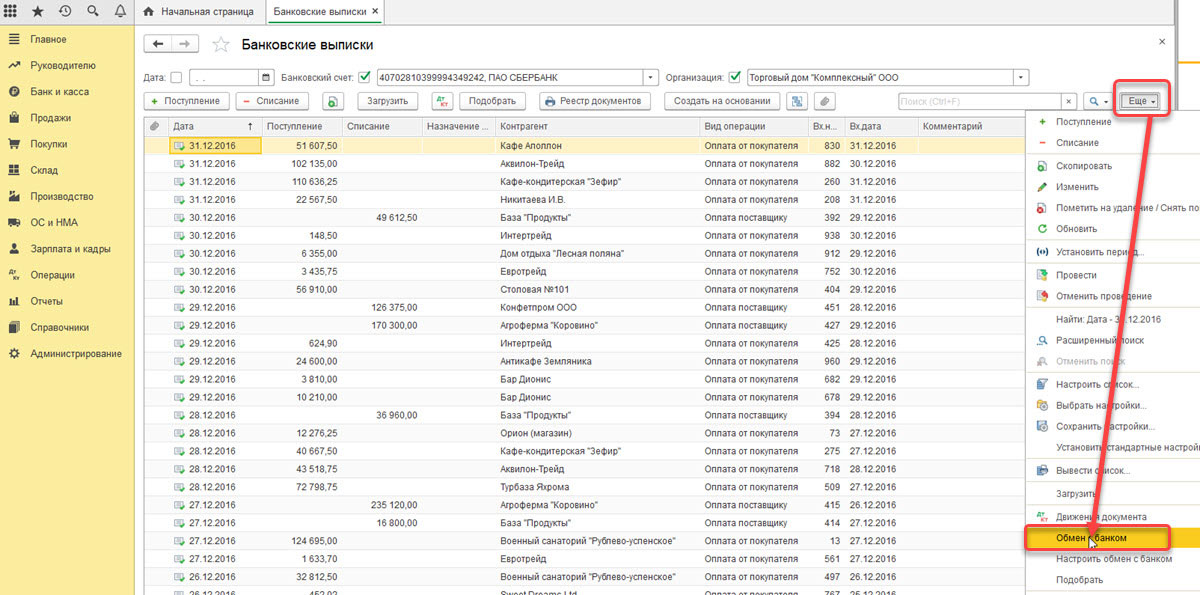 Еще один способ создания «Поступление на расчетный счет» и «Списание с расчетного счета» ― это загрузка банковской выписки. Для оправки документов в банк необходимо нажать «ЕЩЕ-обмен с банком» в журнале «Банковские выписки».