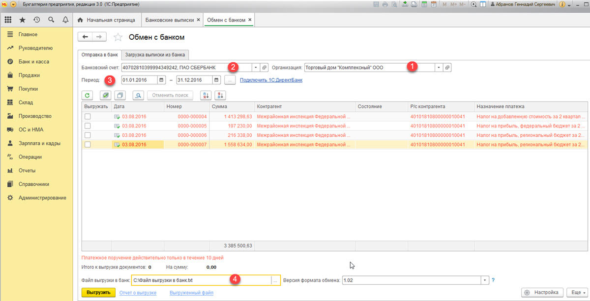 Откроется окно «Обмен с банком», в котором следует перейти к закладке «Отправка в банк»: