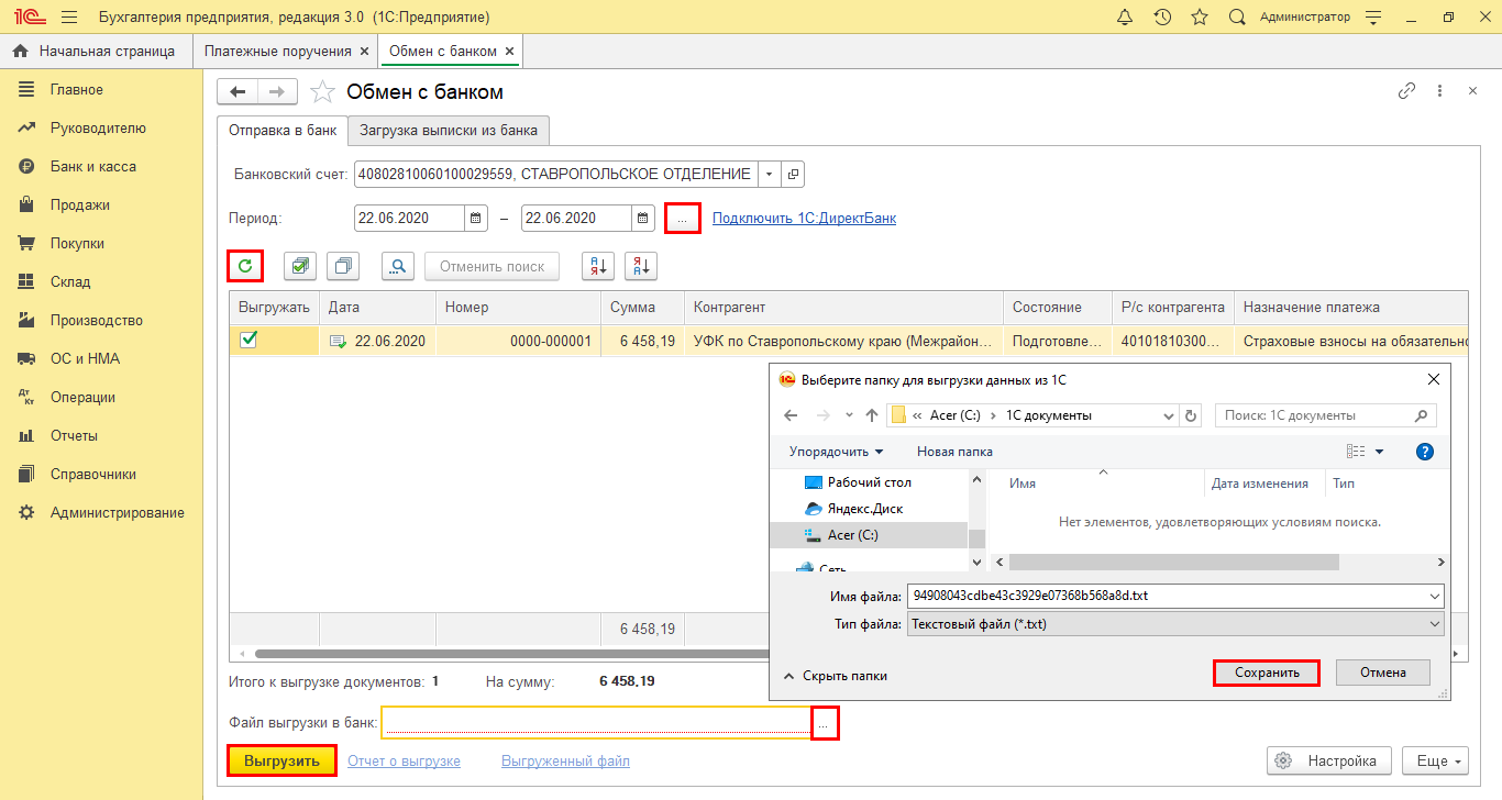 • далее следует нажать на кнопку «Выбрать» в поле «Файл выгрузки в банк». Откроется окно, в котором сформируется название файла в текстовом формате;