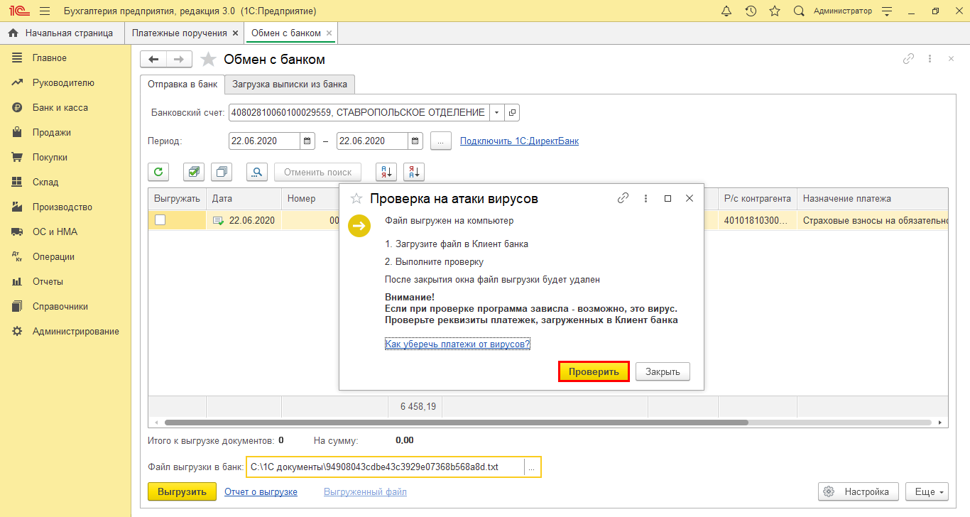 В табличной части отобразятся платежки, которые необходимо оплатить. Напротив каждого документа проставляется «Флаг», затем следует кликнуть на «Выгрузить». Далее откроется окно «Проверка на атаки вируса». После чего необходимо нажать на «Проверить».