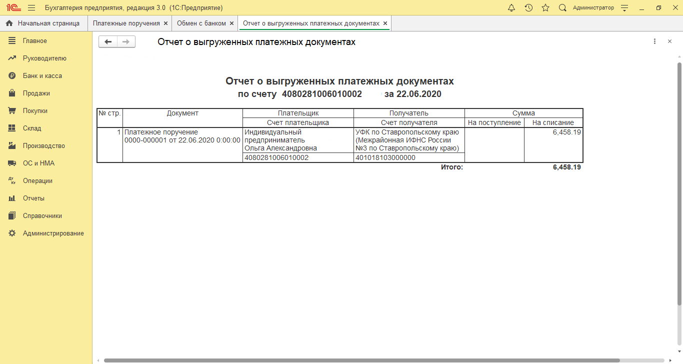 На этом этапе сформируется файл формата «1С_to_kl.txt». Его необходимо загрузить в банк-клиент. Отчет о выгруженных платежных документах отражается в окне «Обмен с банком». Далее необходимо выбрать «Отчет о выгрузке». Отчет будет содержать платежки, выгруженные в файл для последующей загрузки в «банк-клиент». Доступна опция печати или сохранения в любом формате.
