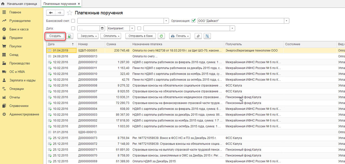 Откроется окно с журналом с платежками, в котором можно выполнить следующие действия: