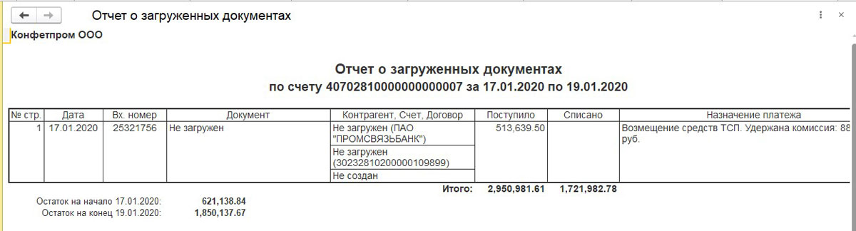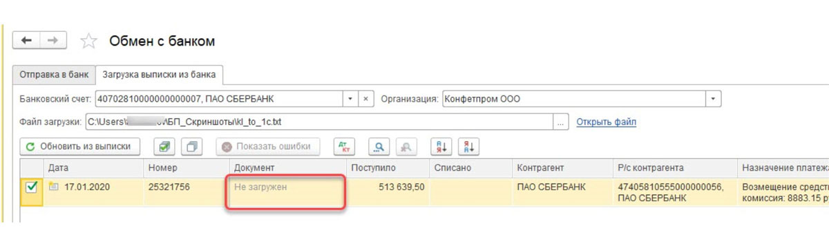 В случае частичной загрузки выписки банка информация отобразится в табличной части «Обмен с банком». Документы, которые не загрузились, появятся в столбце «Документ». По всем загруженным документам будет указана информация «Списание с расчетного счета или Поступление на расчетный счет», а также заданный номер, дата.
