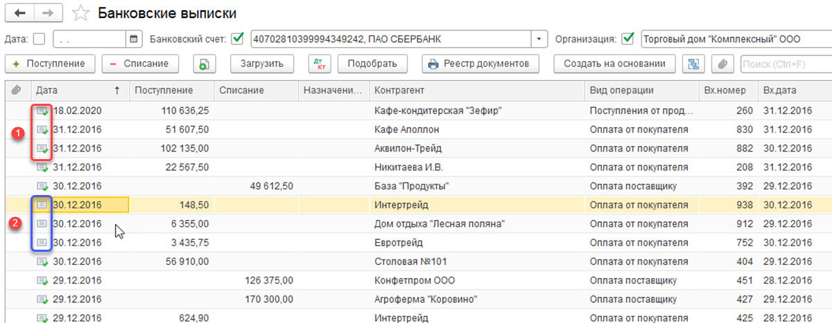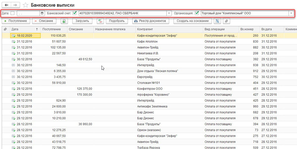 • задать список по конкретной организации, контрагенту, дате или банковскому счету.