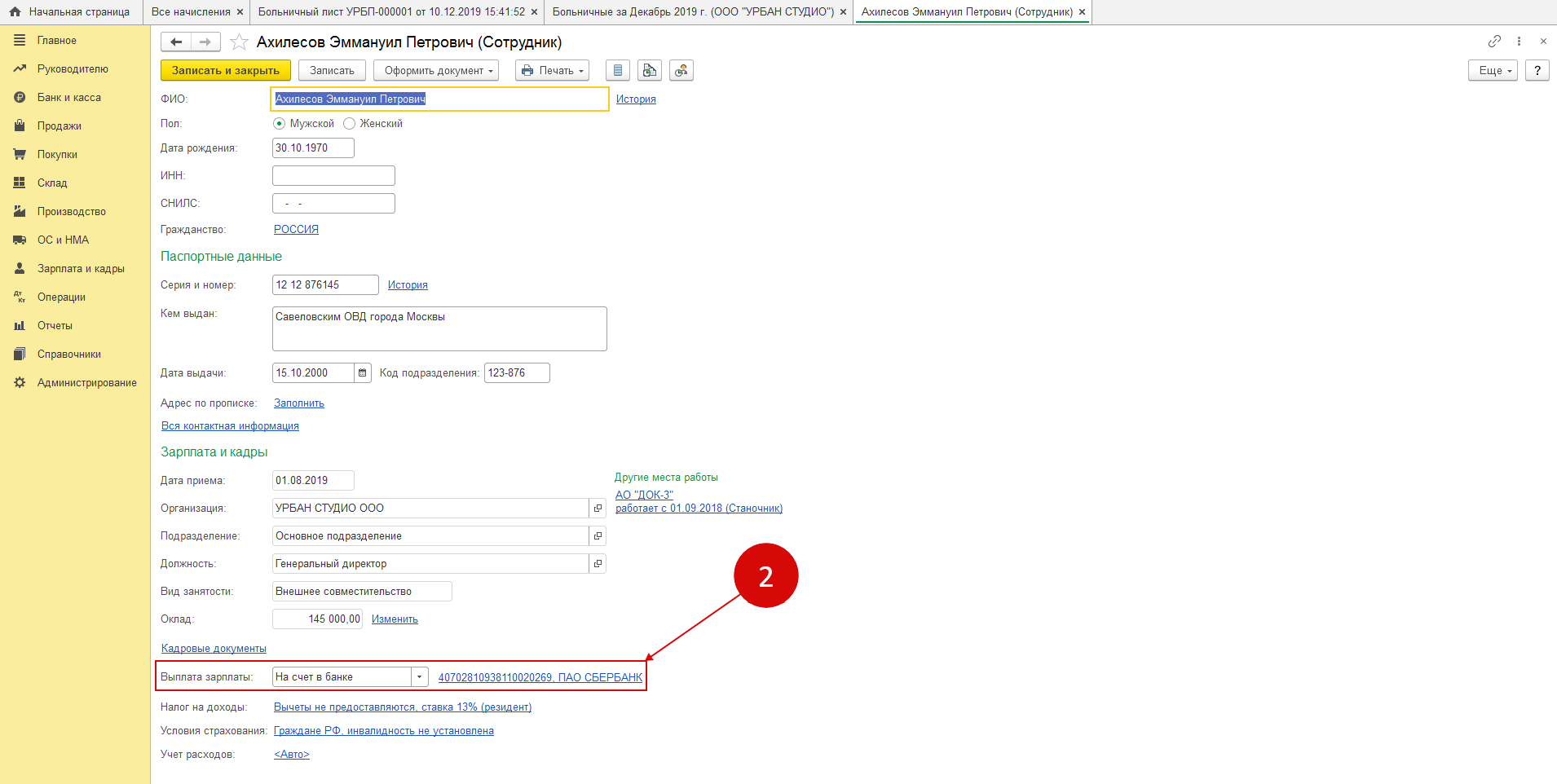 Если в открывшейся карточке работника указан способ выплаты "На счет в банке", то пользователь может воспользоваться специальным "помощником", который поможет сформировать платежку. Для выплаты пособия сотруднику нужно отправить данную платежку в конкретный банк.