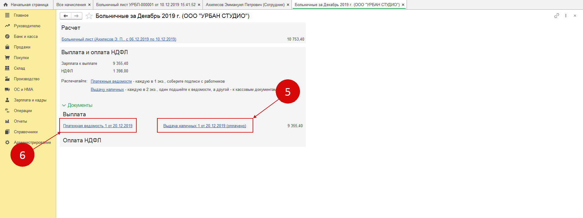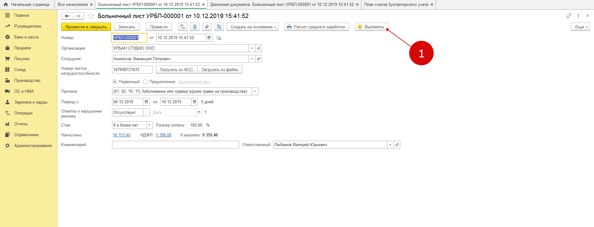 Для того чтобы работник получил положенное ему пособие, в форме больничного листа нужно кликнуть по кнопке "Выплатить".