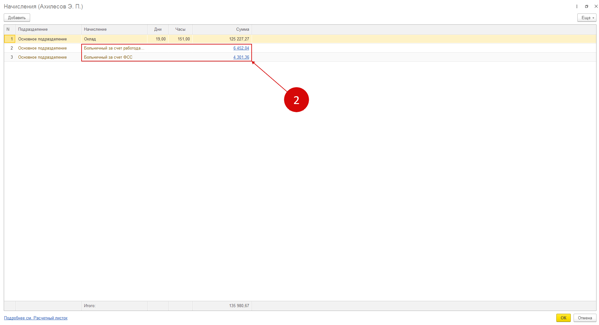 Выплаты по больничному автоматически попадают в документ "Начисления зарплаты". Для проверки отражения больничного в бухгалтерской программе нужно кликнуть по ссылке "Начислено" по конкретному работнику. Далее пользователь может ознакомиться с детализацией начислений за месяц.