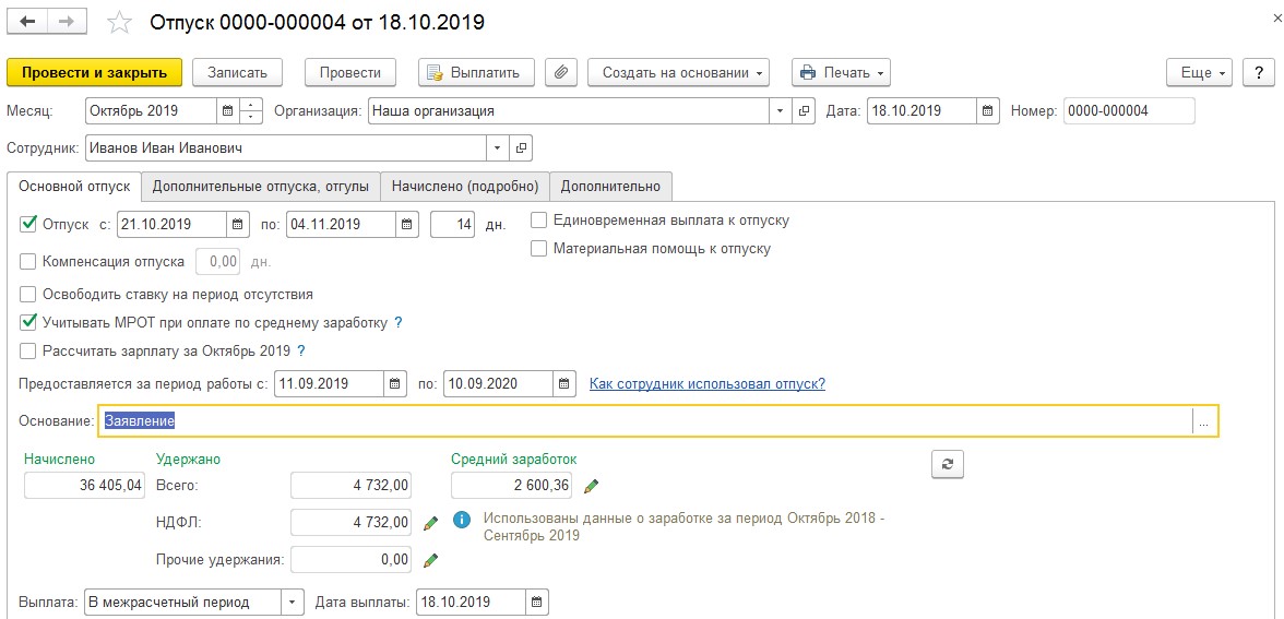 Исходя из суммы среднего заработка, будет произведен расчёт сумм отпускных в автоматическом порядке.