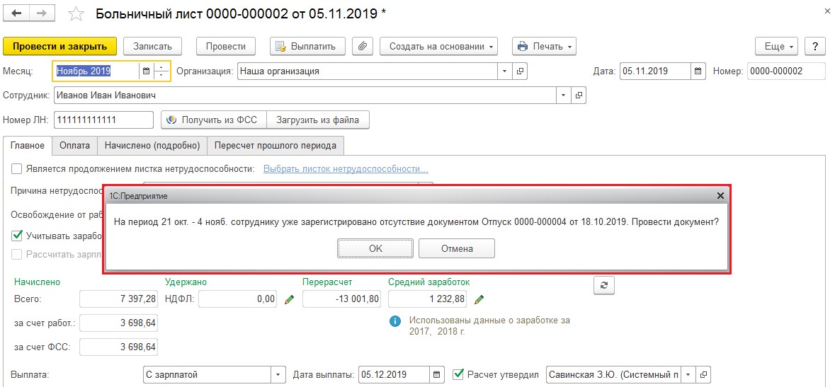 Программа сама произведёт все необходимые расчёты по больничному листу автоматически, а также обязательно сделает перерасчет ранее начисленного отпуска. При формировании документа, на экране появится предупреждение о том, что уже зарегистрировано отсутствие сотрудника за указанный период.