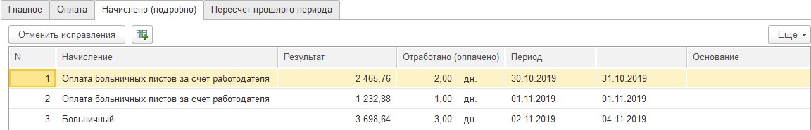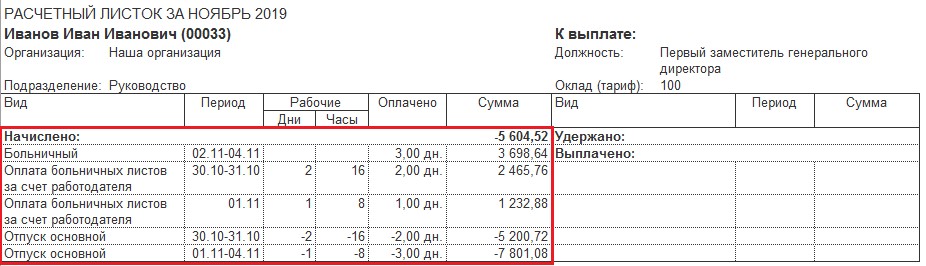На период с 30.10 по 04.11 пришлись дни пересечения, поэтому мы видим отрицательные суммы отпускных. И также видим суммы начисления по больничному листу.