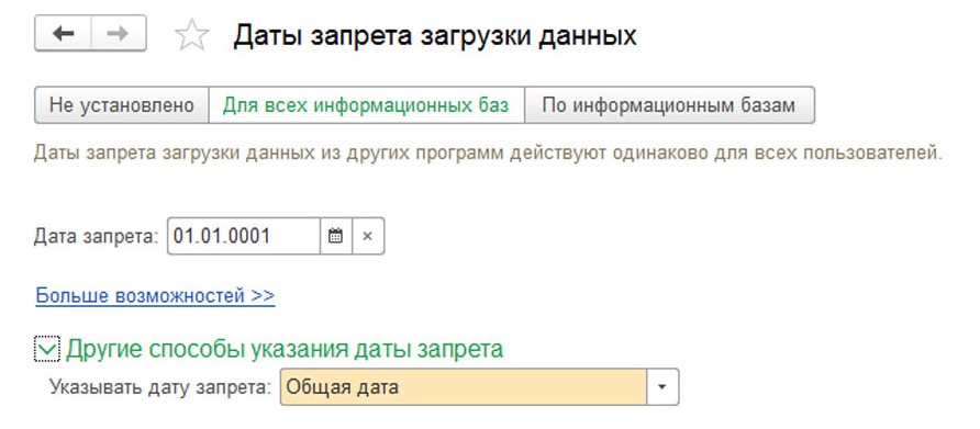 Важно знать, что при выставлении даты запрета, система предлагает выбрать - конец прошлого года, квартала, месяца, недели или установить дату запрета на предыдущий день. В подобной ситуации программа автоматически подберет эту дату. Этими значениями можно воспользоваться в общей настройке и индивидуальной.