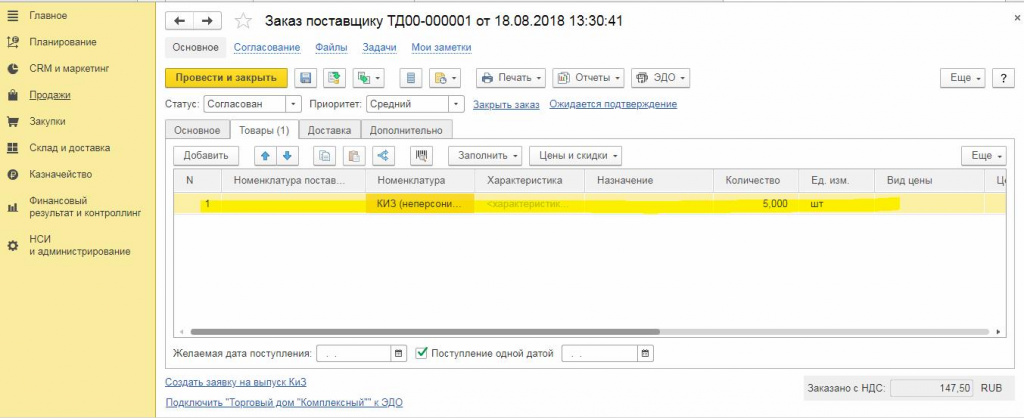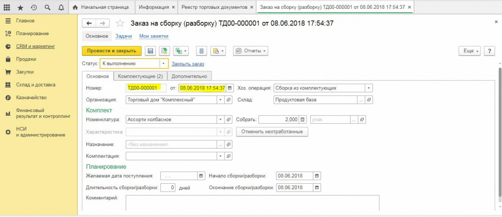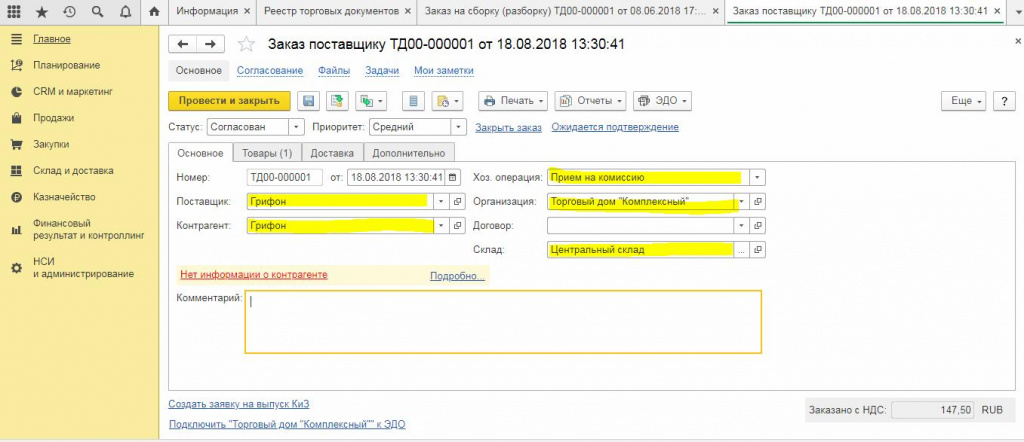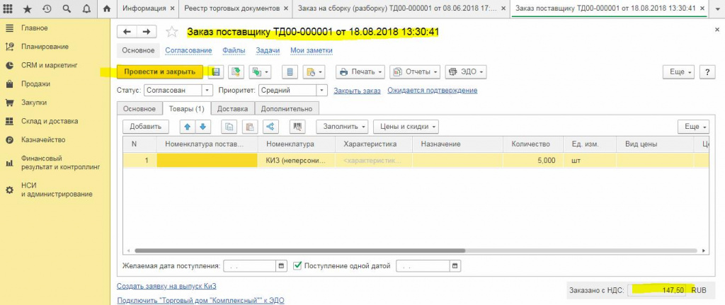 В каждом документе в верхней части есть кнопки типа «Провести и закрыть» или «Записать и закрыть». Например, документ «Заказ Поставщику» должен вносить изменения в состояние расчетов, текущих остатков на складе готовой продукции и заказов, так как у него есть свойство проведения. Для того, чтобы все работало как надо необходимо, чтобы у документа был статус «проведен».