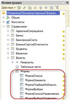 Чтобы пользователю было удобно работать с системой, легко просматривать и изменять данные в документах, программа имеет несколько форм для одного и того же документа. 1С умеет генерировать все необходимые для документа формы. Разработчикам предоставляется возможность конфигурировать самостоятельно формы для документов, которые им необходимы. Увидеть все формы документа можно в конфигураторе системы. Для этого нужно зайти в него и в окне конфигурации выбрать интересующий объект. В раскрытой ветке документа будут отображены все формы документа.