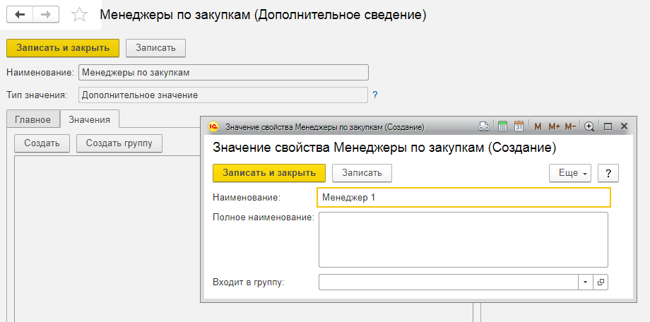 Жмем «Записать и закрыть». С этого момента в документах типа «Поступление (акты, накладные)» появляется возможность присоединить менеджера по закупкам, который занимается этим заказ.