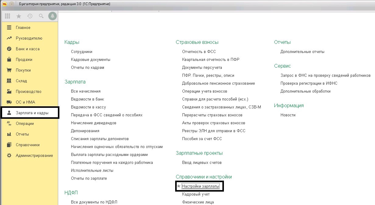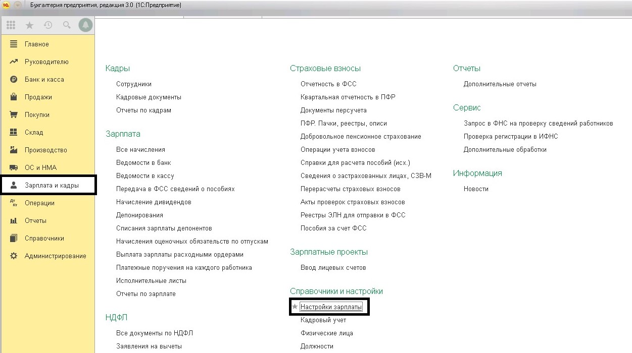 - Нам нужен подраздел «Настройка Зарплаты», расположенный в меню «Зарплата и кадры».