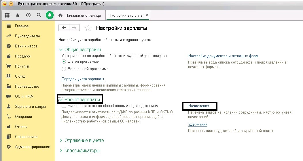 - Ищем подраздел «Настройка зарплаты», расположенный в меню «Зарплата и кадры».