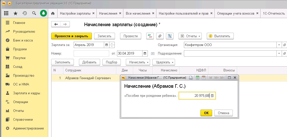 - Вносим данные и завершаем работу в данном разделе. назначить пособие нужного нам типа можно, используя документ «Начисление зарплаты».
