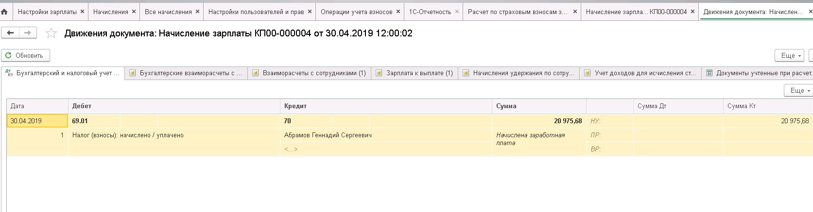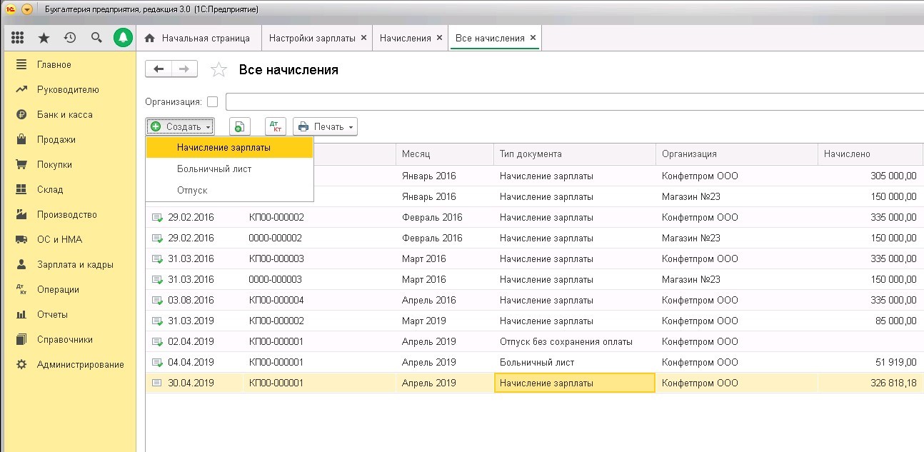 - Формируем документ «Начисление зарплаты», вносим информацию о работнике, для которого предназначена выплата.