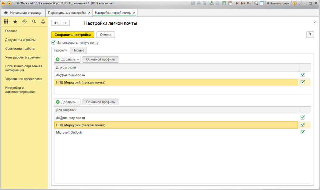 Настройка встроенной почты в 1С:Документооборот 8 КОРП