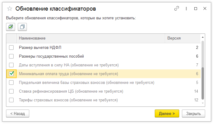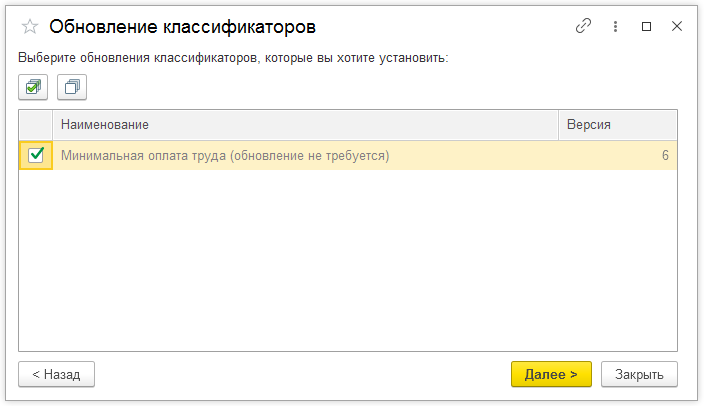 Устанавливаем флажок напротив "Минимальная оплата труда", нажимаем "Далее". МРОТ будет актуализирован.