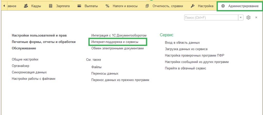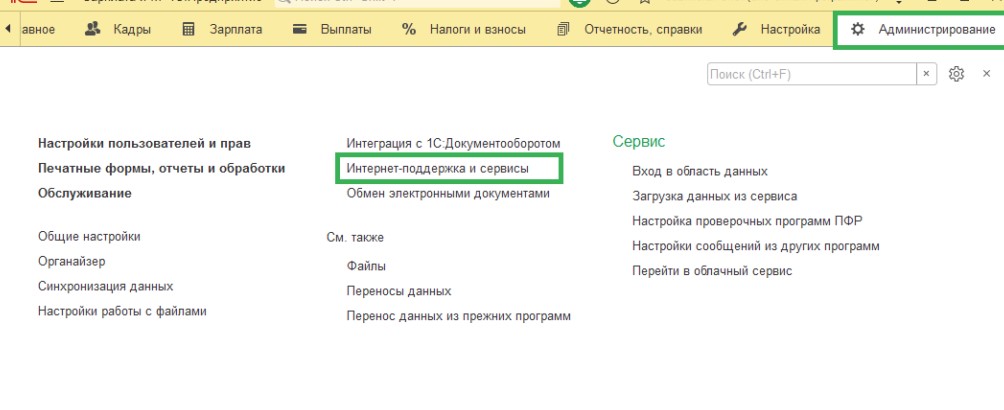 Для загрузки файла открываем "Администрирование", переходим в "Интернет-поддержка и сервисы".