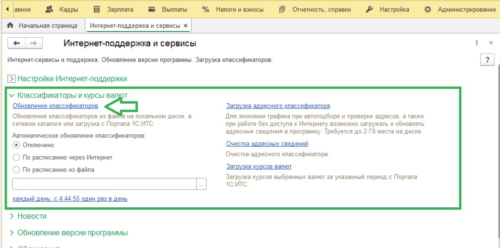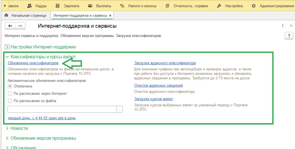 В "Классификаторы и курсы валют" нажимаем на "Обновление классификаторов".