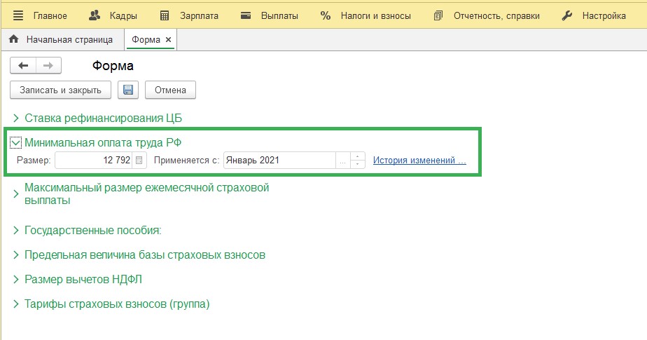 Нужно выбрать период, после чего установить размер МРОТ. Можно открыть свою историю изменений, указать актуальный МРОТ.