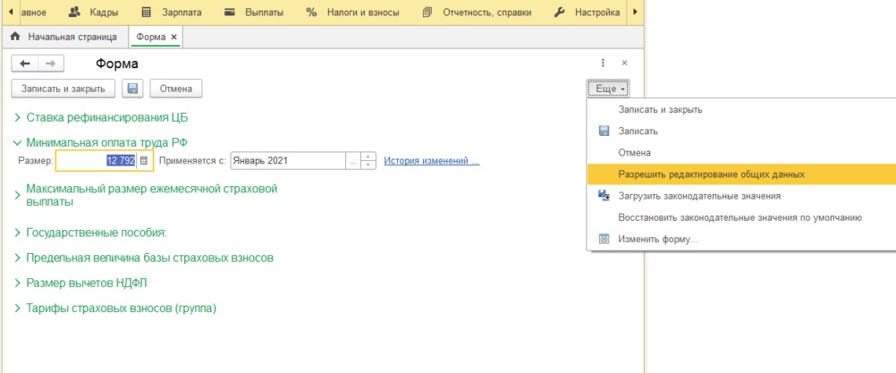 В правом углу нажмите кнопку "Еще" и "Разрешить редактирование общих данных". После этого вы сможете отредактировать минимальный размер оплаты труда.