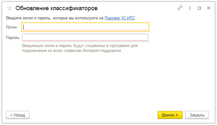 Потом пользователь вводит пароль и логин от ИТС. Данный шаг можно пропустить, если раньше была подключена онлайн-поддержка.
