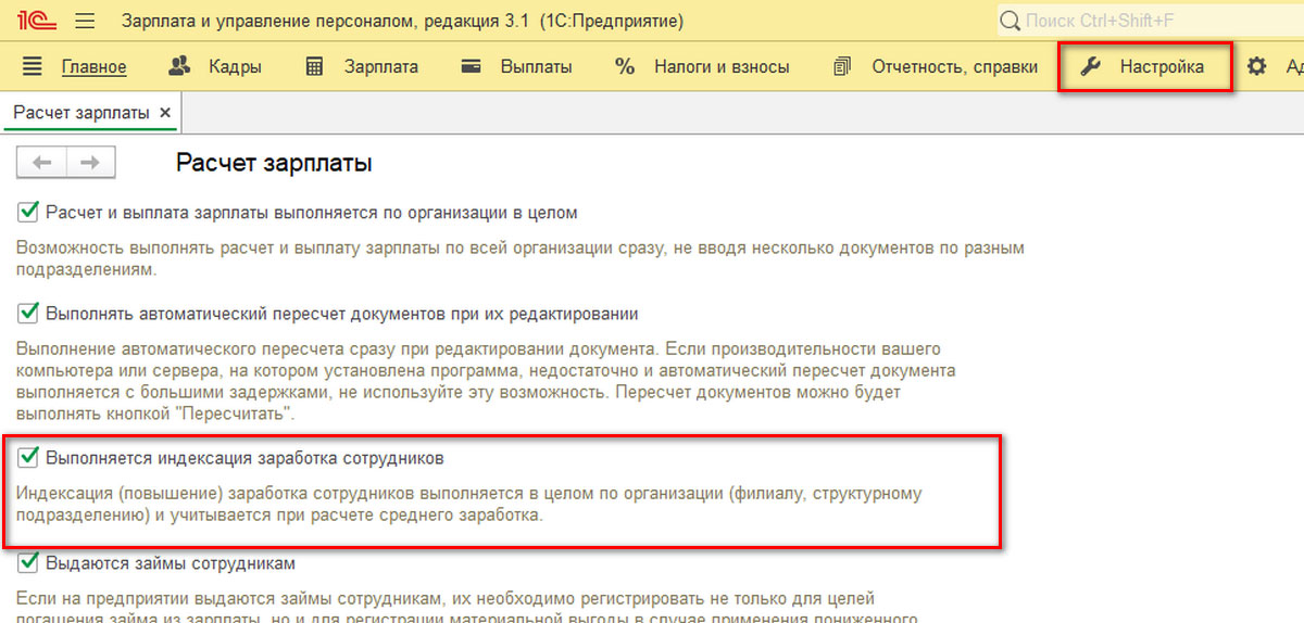 Независимо от того, какой способ индексирования будет использован в дальнейшем, сначала надо зайти в меню «Настройка» и в разделе «Расчет зарплаты» установить соответствующий флажок.
