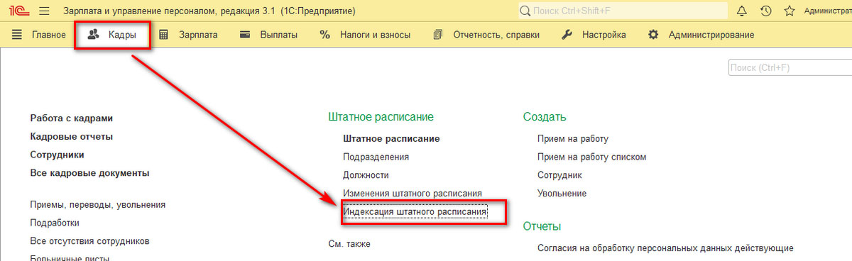 Чтобы реализовать первый способ индексирования, надо зайти в меню «Кадры» и выбрать строку «Индексация штатного расписания».