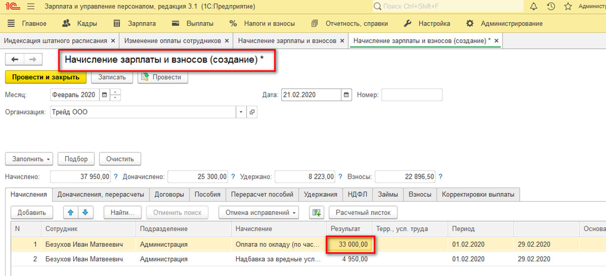 После этого надо рассчитать зарплату. Перейдя в раздел «Начисление зарплаты и взносов», можно увидеть корректную сумму, при формировании которой была учтена индексация.