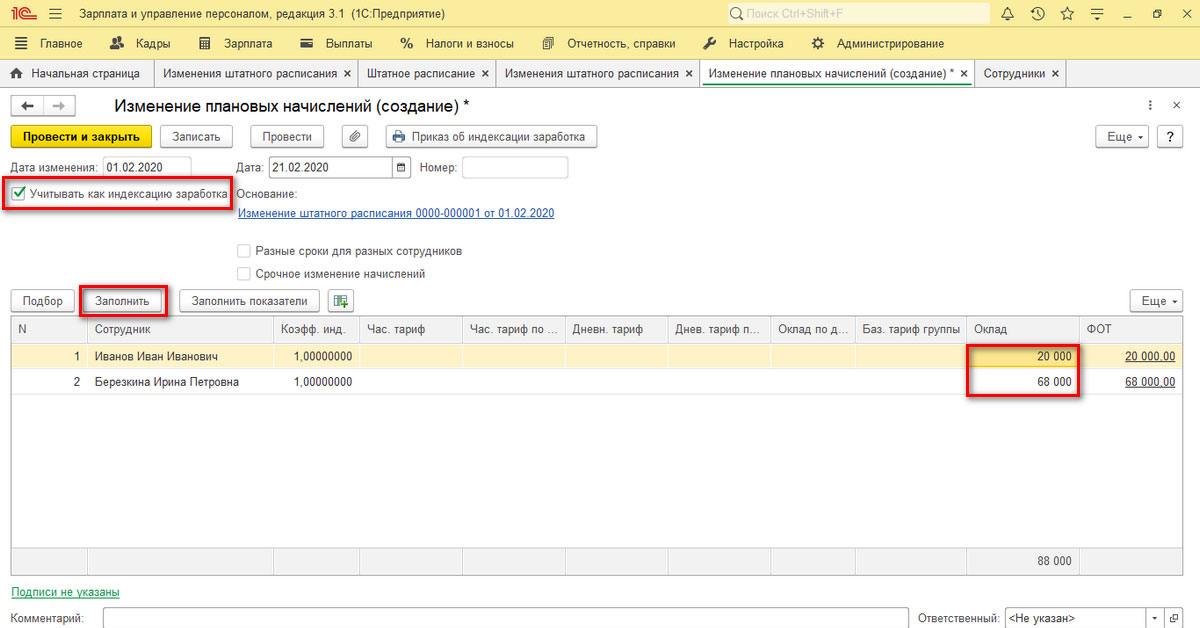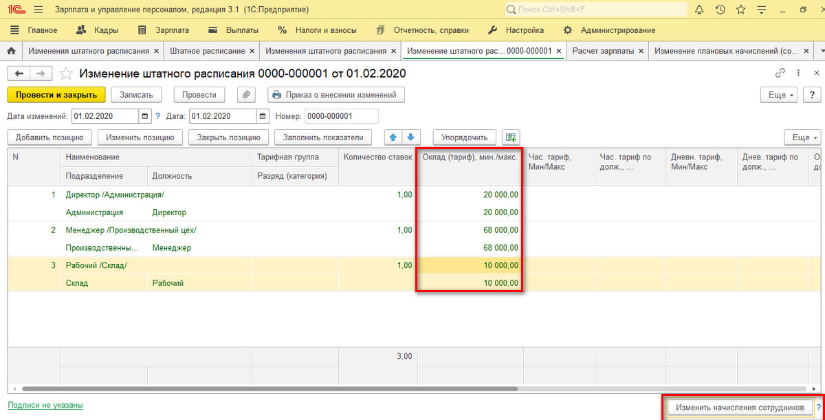 Индексация зарплат через «Изменение штатного расписания»