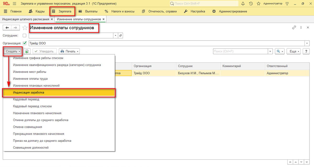 Индексация зарплат через «Изменение штатного расписания»