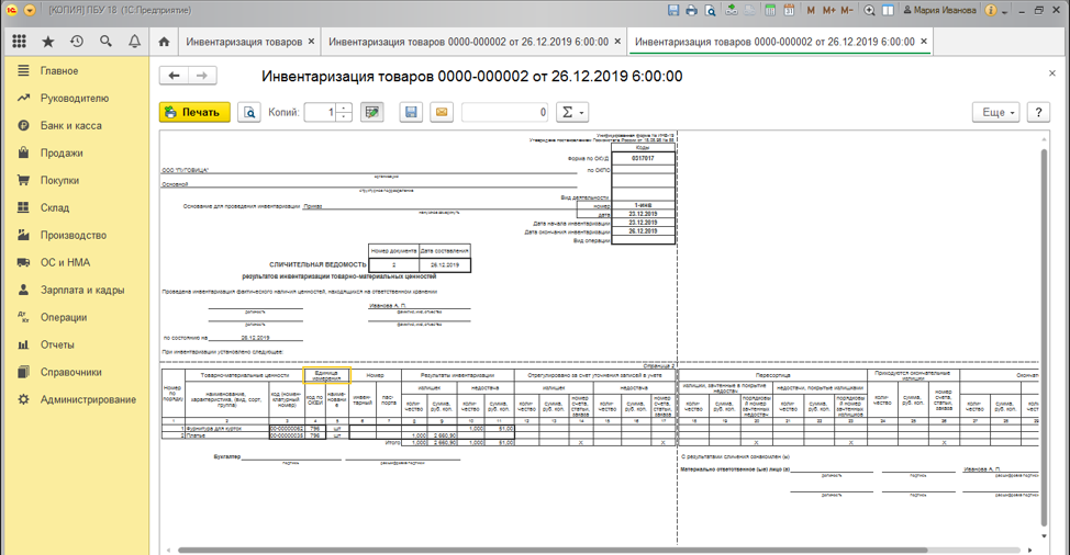 Но если в конце инвентаризации никаких расхождений не было обнаружено, то сличительная ведомость не понадобится — ее не формируют и не распечатывают. Что касается результатов всей процедуры, то их отдают руководителю, а он, в свою очередь, должен сделать выводы касательно отклонений в цифрах.