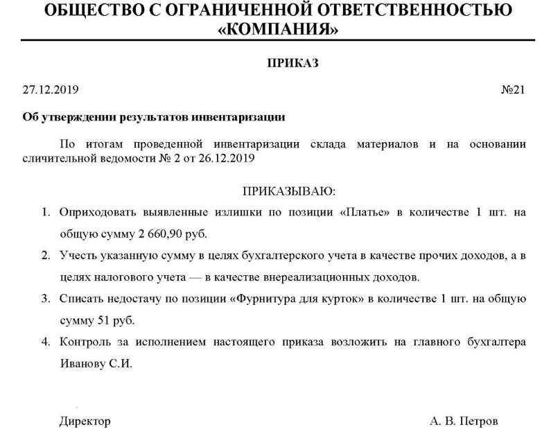 Далее создается распоряжение, в котором указаны все результаты инвентаризации. Руководитель назначает ответственное лицо, которое должно исполнить приказ, а также человека, который будет контролировать исполнение: