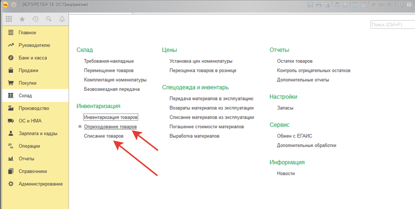 Есть такой важный момент: в «Инвентаризации товаров» невозможно формировать проводки. Если вы хотите отразить все моменты в учете касательно излишков и недостачь то нужно прибегать к другим документам — «Списание товаров» и «Оприходование товаров». Их вы найдете в том же разделе. Нужно зайти сначала в «Склад», а потом нажать на «Инвентаризация».