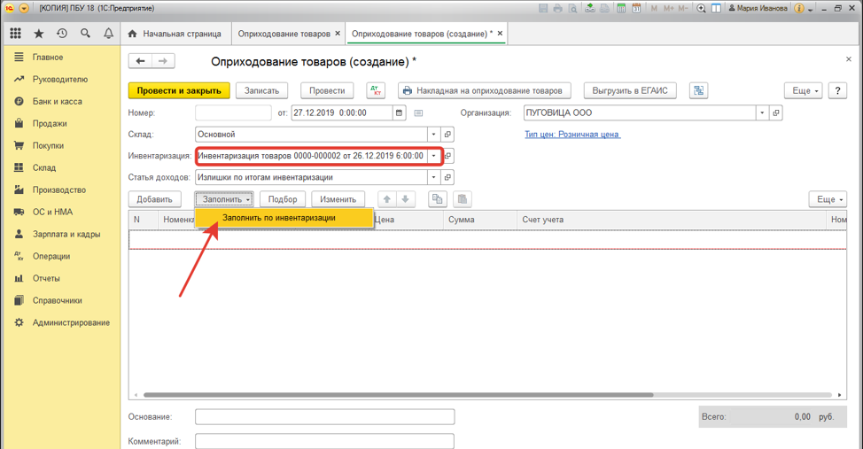 Эти два документа можно заполнить в автоматическом режиме. За основание берутся данные из «Инвентаризации товаров». Для этого нажмите «Создать на основании».