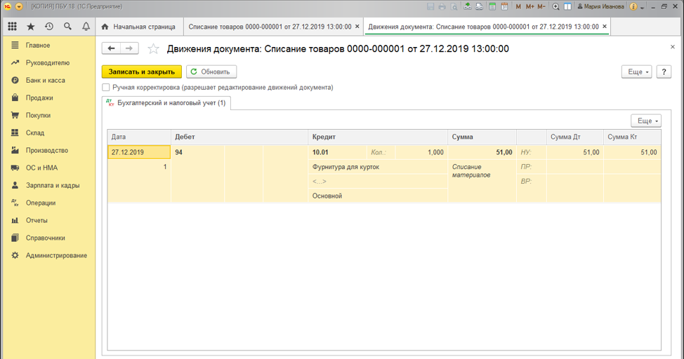 В итоге ваш документ сам сформирует все необходимые проводки: