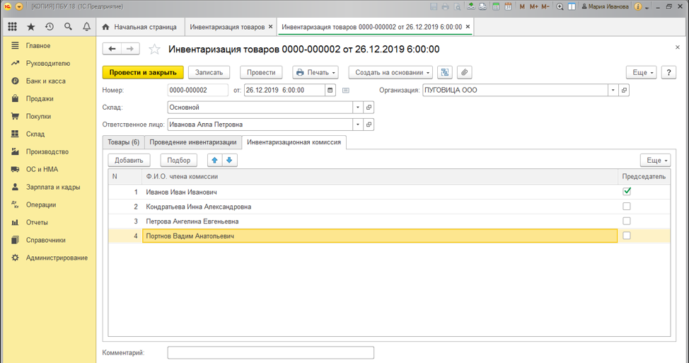 Ни одна процедура инвентаризации не происходит сама по себе. Она имеет документальную подоплеку. Перед тем, как ее проводить, создается приказ. Вы можете распечатать готовый приказ, но перед этим вам нужно внимательно заполнить вкладки «Проведение инвентаризации», а также — «Инвентаризационная комиссия».