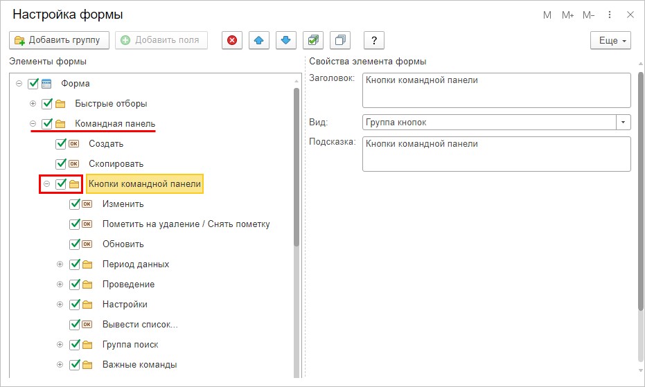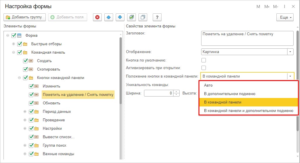 Добавляем на панель кнопки «Провести», «Пометить на удаление/Снять пометку на удаление» и «Отменить проведение».